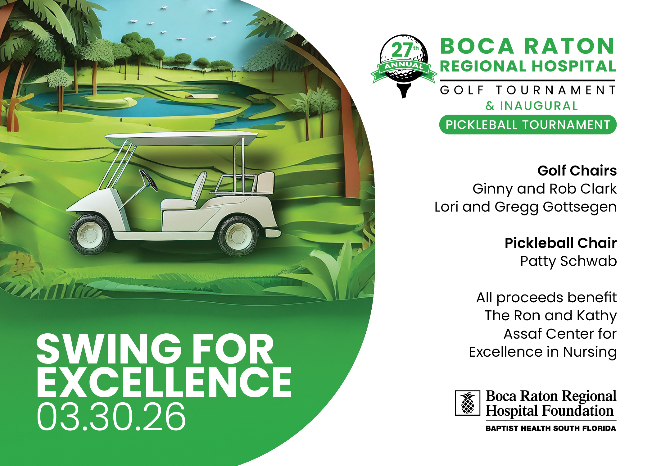 Boca Regional’s Annual Golf Tournament is one of the premier golfing events in South Florida. The tournament offers each golfer a super amenity package, play on championship courses, an award dinner with prizes, and more. The tournament hosts more than 300 golfers at Boca West Country Club. Proceeds benefit the Ron & Kathy Assaf Center for Excellence in Nursing.